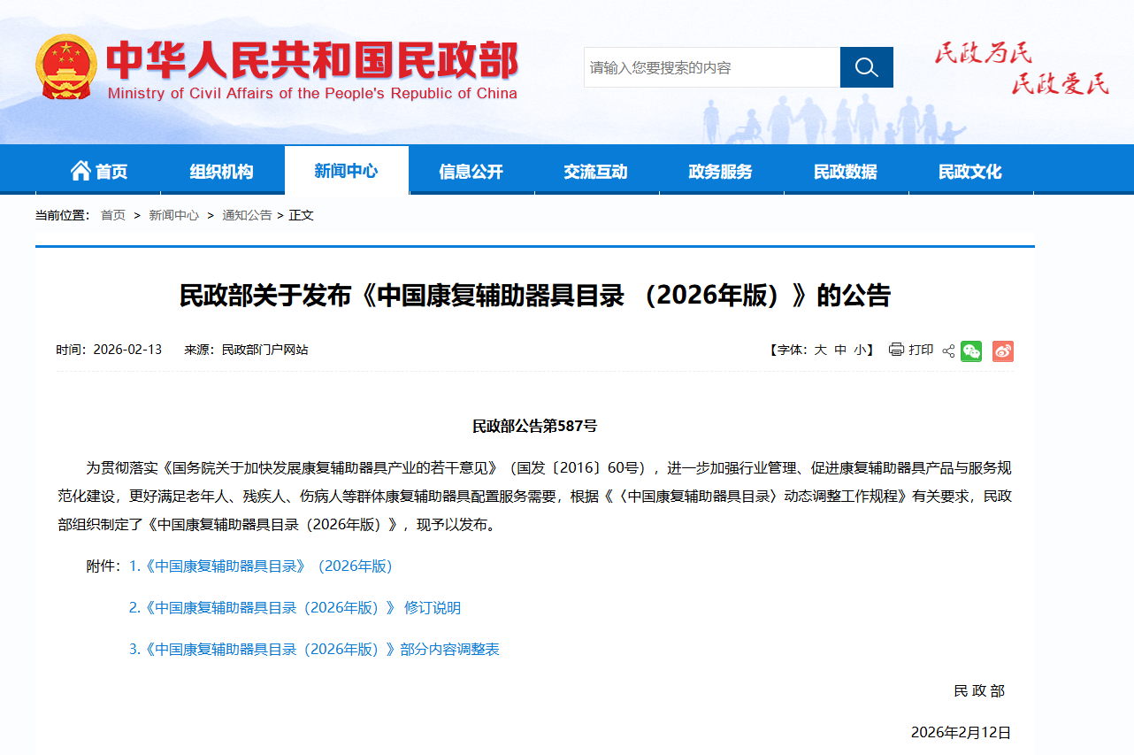 Attached: "China Rehabilitation Assistive Devices Catalogue (2026 Edition)" official announcement and attachment inquiry method: